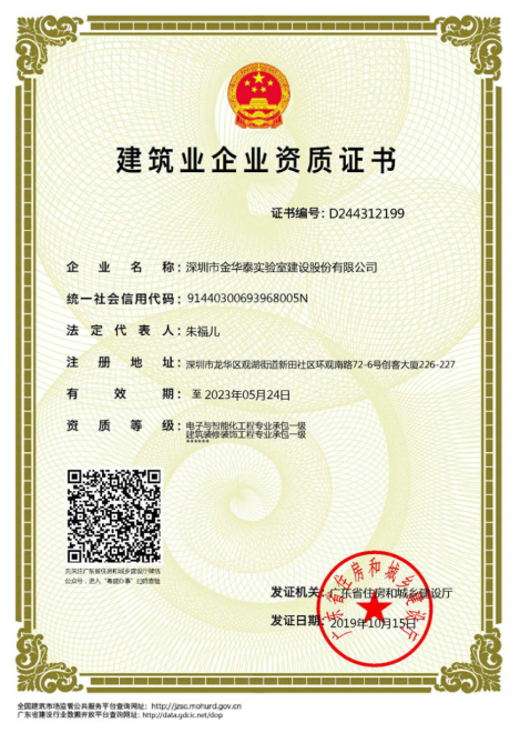 深圳市金華泰實驗室建設(shè)股份有限公司致力于開發(fā)高品質(zhì)實驗室專業(yè)產(chǎn)品,申請并獲得了一系列的專利證書及實驗室各領(lǐng)域軟件著作權(quán),企業(yè)已通過ISO9001:2008質(zhì)量管理體系認證及ISO14001:2004環(huán)境管理體系認證,公司秉承“綠色、技術(shù)、安全、舒適”的建設(shè)理念,以質(zhì)量為根本,以創(chuàng)新求發(fā)展以誠信樹品牌,與眾多跨國公司建立長久合作關(guān)系,始終引領(lǐng)行業(yè)發(fā)展潮流。深圳金華泰從前期咨詢、現(xiàn)場測量、設(shè)計師初稿確認、方案修改及初步報價、確認方案及報價、簽署工程合同、正式施工階段、保質(zhì)保量竣工驗收、售后服務(wù)提供一站式實驗室解決方案服務(wù)。